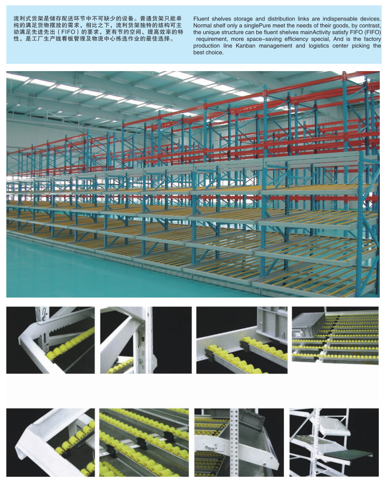 流利式貨架又稱滑移式貨架,采用輥輪鋁合金,鈑金等流利條,利用貨物臺(tái)架的自重,從一邊通道存貨,另一邊通道取貨實(shí)現(xiàn)先進(jìn)先出,存儲(chǔ)方便,以及一次補(bǔ)貨多次取貨。流利貨架是存儲(chǔ)配送環(huán)節(jié)中不可缺少的設(shè)備,普通貨架只能單純的滿足貨物擺放的需求,相比之下,流利式貨架的獨(dú)特結(jié)構(gòu)可主動(dòng)滿足先進(jìn)先出的要求。
