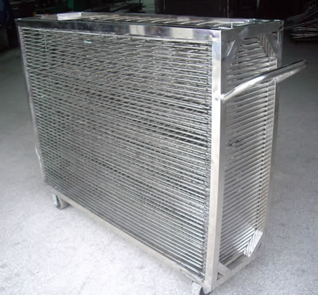 千層架,又叫絲印千層架、乾燥架、千層車、晾曬架、晾紙架、網(wǎng)架、層架臺車。適用于印刷、上膠、噴漆、上色,濺鍍後的晾乾置放器材;顒邮蕉鄬泳W(wǎng)格設計,置放空間大,操作方便,節(jié)省車間、庫房面積,并可適用於所放產(chǎn)品的常溫晾乾和進焗爐高溫烘烤。